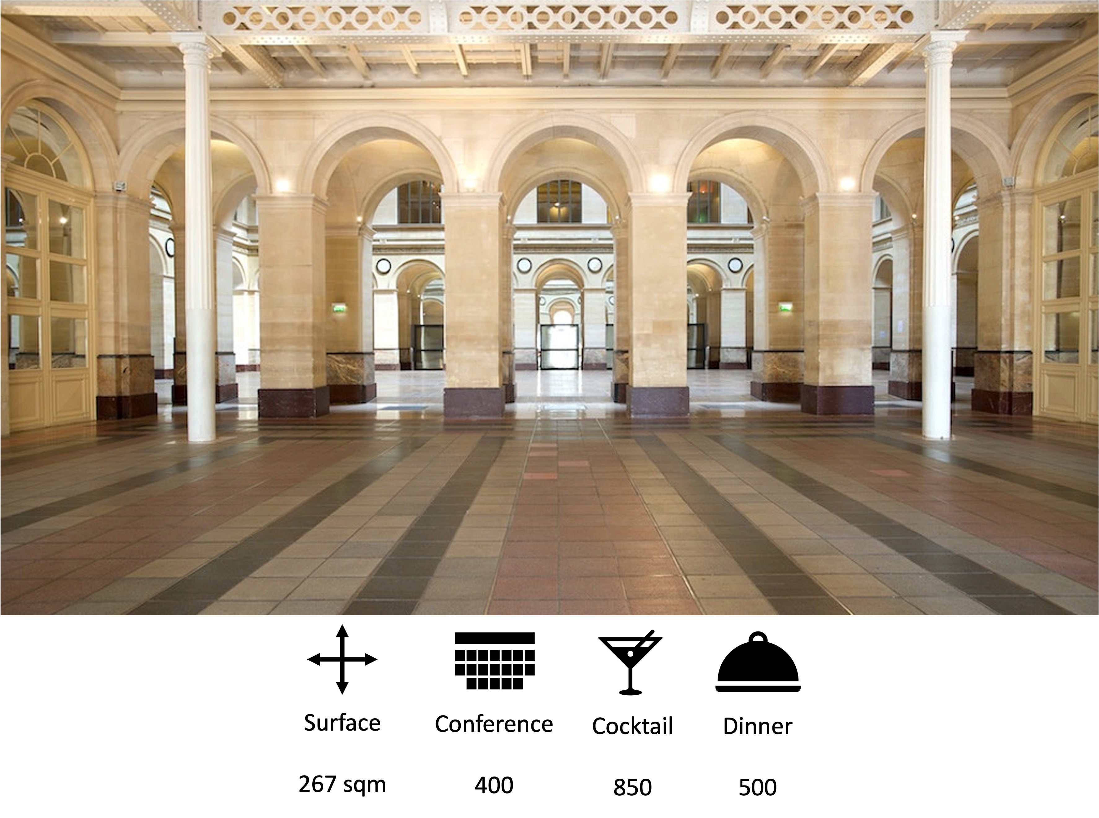This room is very often used for standing cocktails during events in the Nef but can also be used in different ways, such as a dance floor or a lounge area offering a cosy space with natural light and access to the peristyle.